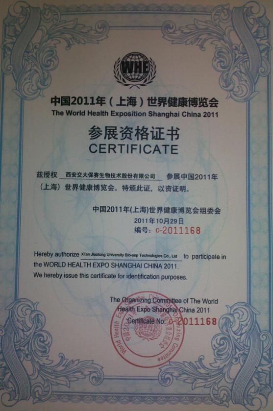 2011年11月參加的“建設創新型國家大會暨中國2011年(上海)世界健康博覽會”上,向國內外參展公司展示了公司研發的六級超濾凈水器、反滲透凈水器、介質過濾煙嘴、懸浮式筷子籠等健康生活品,極具科技含量與創意的新產品獲得了參會全體的認可,我公司被授予“中國2011年(上海)世界健康博覽會推薦產品獎”。