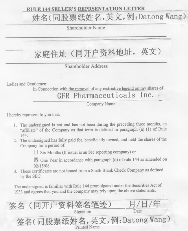 五、股東將表格2份、GFRP股票紙(原件)、委托書、身份證復印件、匯款憑證(原件)、填寫好的信封一共7份資料按規定方式寄到公司。