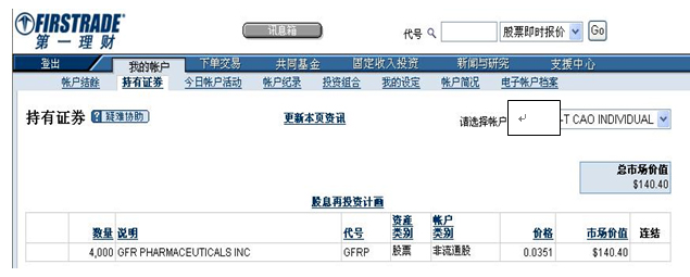 自2008年9月1日公司發布致股東公開信(十六)——GFRP公司股票存入的公告后,公司證券部給公司部分要求存股票紙的股東辦理的第一批股票紙已陸續存入股東個人在美國第一理財證券公司開設的交易賬號中,請辦理股票紙存入的股東登入股東個人賬號,仔細核對股票紙。美國第一理財證券公司處理股票紙的時間約一個月左右,敬請股東耐心等待。如有問題,請及時與公司證券部聯系。